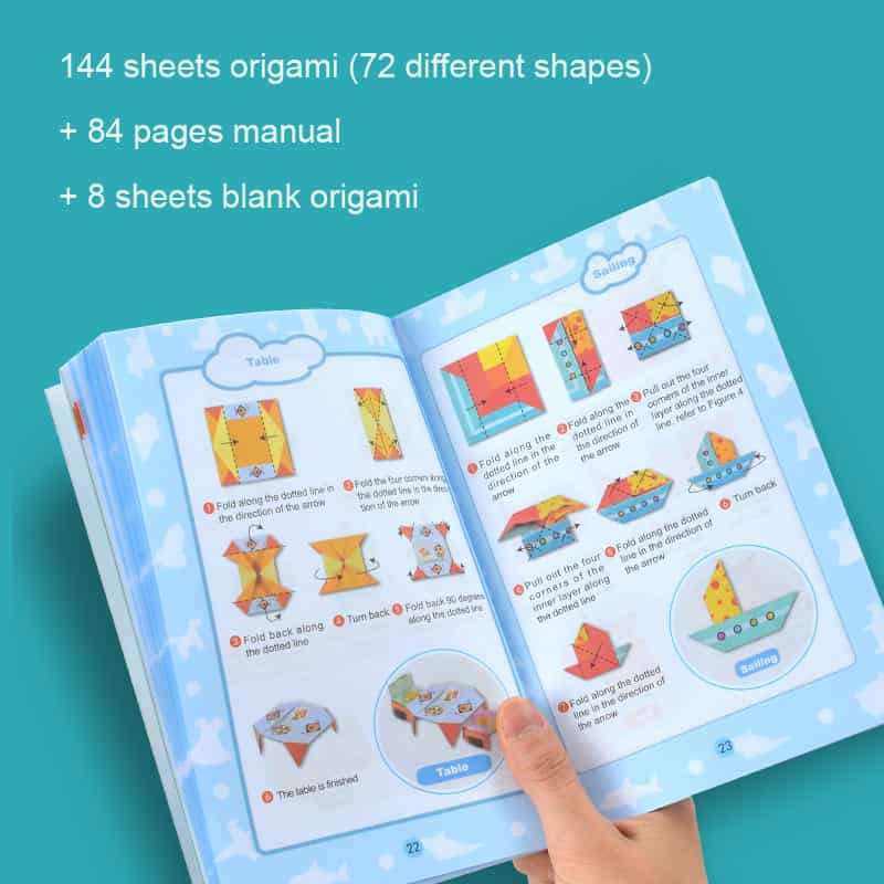 - Incluido en el paquete: 144 hojas de origami (72 formas diferentes), 84 páginas de manual (escrito paso a paso que puede abrir la mente de los niños) y 8 hojas en blanco / papeles para práctica